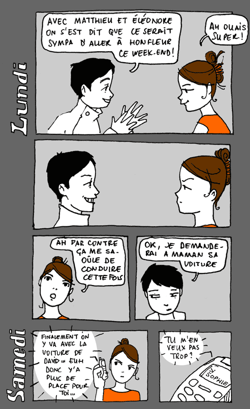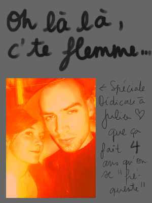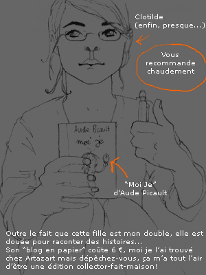 La journée d'hier, contrairement à ce qu'aurait pu laisser croire le message précédent, a été parfaite. Avec Julien, on a visité des apparts ensemble, pas tous géniaux, pas tous là où on voulait, mais c'était bien. On est passés chez Artazart faire semblant d'être des artistes, puis on a voulu aller au cinéma voir BigFish, mais c'était complet, alors on est allés dîner dans une crèperie. Comme on avait beaucoup marché, on était très fatigués, alors pour se donner de l'énergie nouvelle et ne pas arriver tout mous à la soirée organisée chez Élise et Mathieu, on a bu beaucoup de cidre. On est arrivés en avance à la soirée, on a rencontré des gens qu'on ne connaissait pas mais qui étaient très gentils, on a continué à boire un peu... beaucoup. On est rentrés en vrais galériens, marchant de Montparnasse à Sébastopol en guettant un taxi, puis on a couru comme des dératés pour avoir le noctambus qui, ô chance, passait à ce moment là ... Puis aucun souvenir jusqu'à ce matin 12:43. J'ai alors pris conscience que ça faisait des mois que j'avais pas autant bu, c'est déplorable, j'avoue, mais ça m'a ouvert les yeux sur mon achat d'hier : "EGO" et "Moi je"... Honnêtement, j'avais pas remarqué la blague avant ce matin!