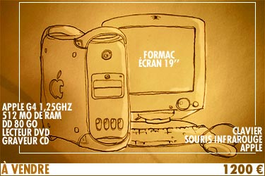 ... je crois que tout est dit :) Je précise que j'ai acheté l'ordinateur neuf en septembre 2003, que c'était la première fois que je faisais un achat ce cette importance et que du coup, depuis, je l'ai chouchouté... il est en parfait état! En revanche si quelqu'un est intéressé, il va falloir être patient, parce je ne le vendrai que quand j'aurai reçu le nouveau... d'ici un mois, j'espère :D Faites passer!