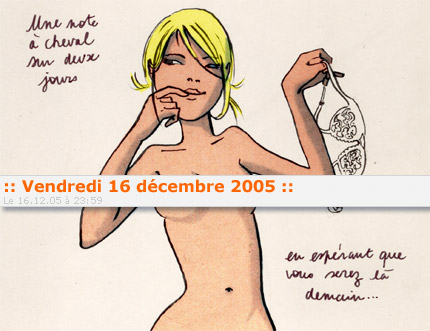 Hier : 10 de baby-sitting avec Justine, bientôt 7 mois. Aujourd'hui : 2 heures au bureau avec, à côté de moi, une vingtaine d'enfants de 0 à 5 ans qui piaillent autour de l'arbre de Noël de la société, et Tracy, 2 ans pile poil, très sûre d'elle, qui vient s'asseoir sur mes genoux pour me montrer qu'elle aussi, elle peut être graphiste. Ce soir : une rencontre dans le métro, un ami que je ne vois pas souvent qui m'annonce qu'il va être papa.