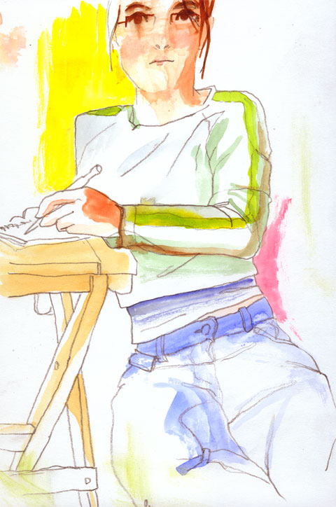 En prévision de notre long week-end à Venise (du 16 au 19 novembre), j'ai acheté une boîte d'aquarelle... j'ai tout oublié des cours que j'avais eus sur l'utilisation de cette saleté de flotte colorée :D Du coup le résultat est un peu caca, mais bon, une image à poster c'est toujours bon à prendre. Et puis ça faisait deux mois que j'avais pas fait d'autoportrait, ça va pas du tout, ça!